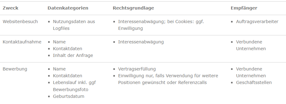 Wir verarbeiten Deine personenbezogenen Daten, um Dir unsere Website zur Verfügung zu stellen, Deine Bewerbung, die Du uns auch über die Website zusenden kannst, und Deine Kontaktanfragen zu bearbeiten. Dies tun wir nur für den jeweiligen Zweck und nur im gesetzlich zulässigen Umfang, entweder auf Basis Deiner Einwilligung (z. B. im Rahmen des Bewerberpools), zur Durchführung vorvertraglicher Maßnahmen (Durchführung des Bewerbungsverfahrens im Hinblick auf ein mögliches vertragliches Beschäftigungsverhältnis) oder auf Basis unseres berechtigten Interesses (z. B. bei der Zurverfügungstellung unserer Website).