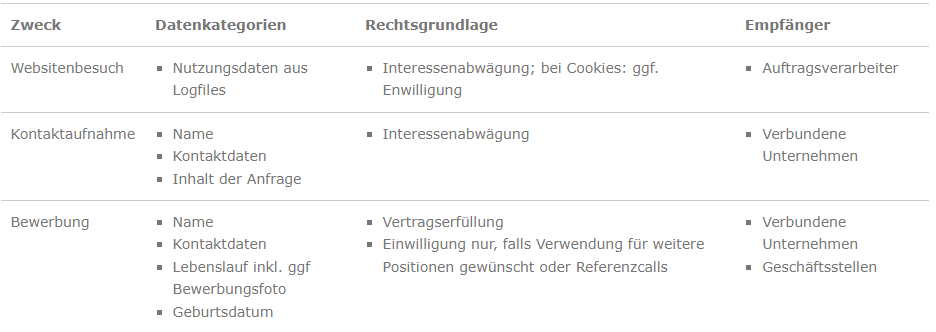 Wir verarbeiten Ihre personenbezogenen Daten, um Ihnen unsere Website zur Verfügung zu stellen, Ihre Bewerbung, die Sie uns auch über die Website zusenden können, und Ihre Kontaktanfragen zu bearbeiten. Dies tun wir nur für den jeweiligen Zweck und nur im gesetzlich zulässigen Umfang, entweder auf Basis Ihrer Einwilligung (z. B. im Rahmen des Bewerberpools), zur Durchführung vorvertraglicher Maßnahmen (Durchführung des Bewerbungsverfahrens im Hinblick auf ein mögliches vertragliches Beschäftigungsverhältnis) oder auf Basis unseres berechtigten Interesses (z. B. bei der Zurverfügungstellung unserer Website).