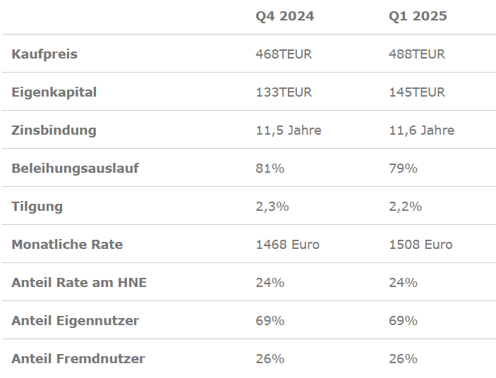 Die Effekte des Zinsanstiegs sieht man auch in den Interhyp-Daten. Die Menschen bringen wieder mehr Eigenkapital in die Finanzierungen ein. Der Beleihungsauslauf, der Auskunft darüber gibt, wie hoch der Anteil des Eigenkapitals im Vergleich zu dem geliehenen Kapital ist, lag in Q1 2025 im Schnitt bei 79% – nach 81% in Q4 2024.