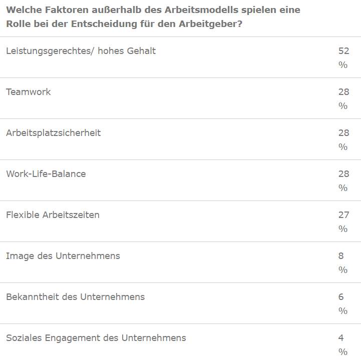 Schon eher relevant als Entscheidungskriterien sind bei den Befragten jene Eigenschaften, die gemeinhin eine gute Unternehmenskultur ausmachen: von der Sicherheit des Arbeitsplatzes über flexible Arbeitszeiten bis hin zu Teamwork und Work-Life-Balance. Die größte Rolle spielt ein hohes oder leistungsgerechtes Gehalt (52 Prozent).