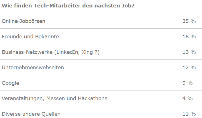 Ihren aktuellen Arbeitgeber fanden die Tech-Fachkräfte hauptsächlich über Online-Jobbörsen, Freunde, Bekannte und auch Business-Netzwerke. Gerade bei bekannten Unternehmen spielen auch die Unternehmenswebseiten und die Suchmaschine Google eine gewisse Rolle.
